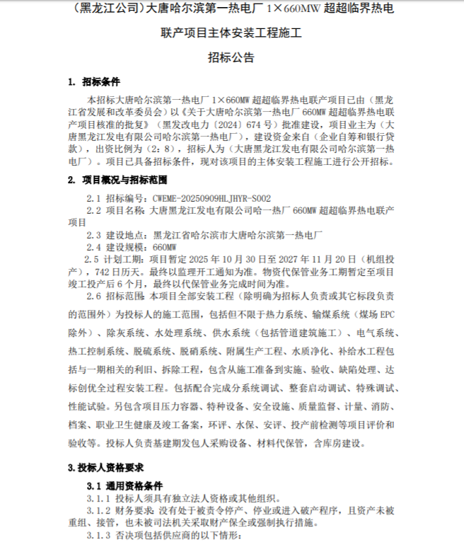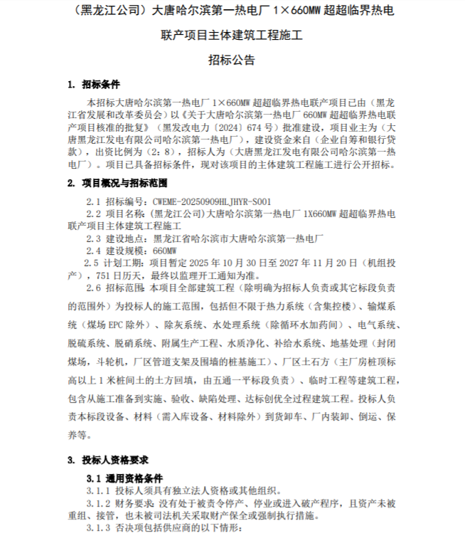 大唐哈爾濱第一熱電廠1×660MW超超臨界熱電聯(lián)產(chǎn)項目主體建筑工程施工招標(biāo)公告